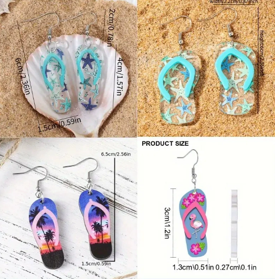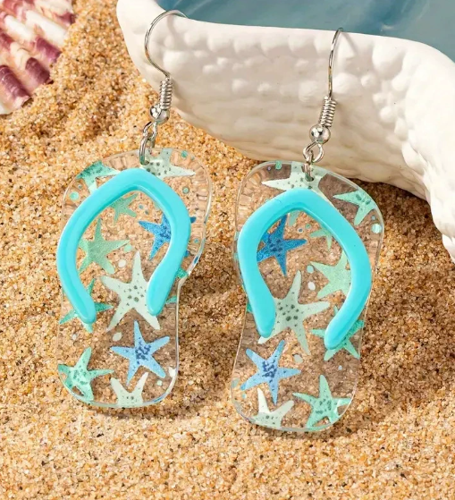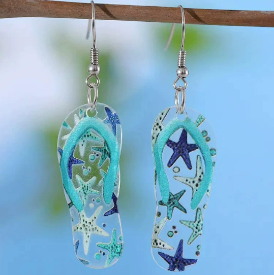 Ocean style pendant earrings, acrylic slippers, design for seaside parties with everyday wear